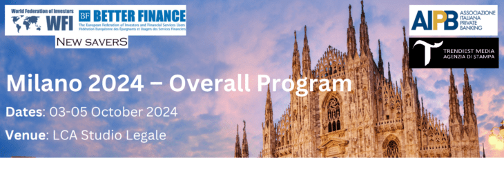 L’argomento verrà affrontato, insieme a tanti altri temi analoghi, il prossimo 4 ottobre a Milano, nel Convegno organizzato dall’associazione World Federation of Investors con la collaborazione di Better Finance, la leader ONG europea maggiormente coinvolta negli organi consultivi legati alla finanza e alle imprese europee e alle politiche di governo. Dal 2012 gode del sostegno dell’Unione Europea per aumentare l’engagement degli utenti dei servizi finanziari e dei singoli investitori nella definizione della politica finanziaria dell’UE.