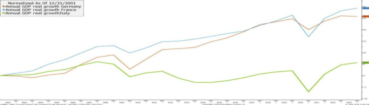 Grafico: confronto crescita del Pil reale di Italia, Germania e Francia, Bloomberg L.P.