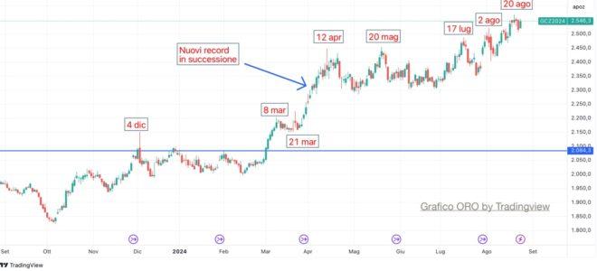 Con alti e bassi, momenti di crescita e periodi di pausa, il prezzo dell’oro continua a stupire: il record più recente è stato segnato qualche giorno fa: il 20 agosto.