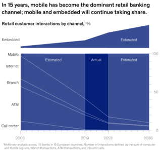 - Il canale online è stato lanciato da alcune banche negli anni ’80, ma non ha guadagnato terreno fino alla metà degli anni 2000, quando l’uso di Internet si è diffuso. Secondo un’analisi di McKinsey, nel 2008 la penetrazione del canale basato su Internet era compresa tra il 30% e il 40% nella maggior parte dei mercati dell’UE, ad esempio il 38% in Germania e nel Regno Unito. Il canale bancario mobile è decollato intorno al 2008 con l’adozione diffusa degli smartphone.