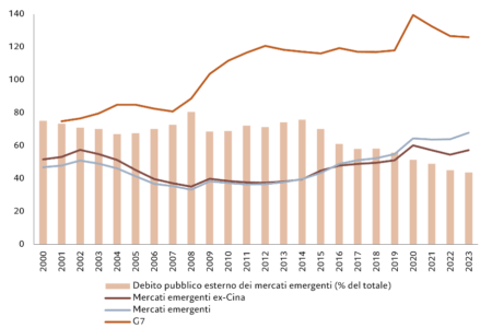 Rapporti debito pubblico/PIL dei mercati emergenti e dei Paesi del G7 e quota di debito emessa all’estero (%)