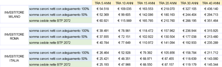 Nel caso di immobili a Milano o Roma, a causa del minor rendimento netto immobiliare, in uno scenario di rivalutazione dei canoni al 100% dell’inflazione, il BTP resterebbe competitivo per i primi dieci anni, per poi essere superato dal rendimento immobiliare; in uno scenario di rivalutazione dei canoni per il 50% dell’inflazione, invece, i BTP si dimostrerebbero più competitivi per ogni orizzonte temporale.