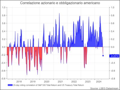 Dopo anni di ritorni difficili, infatti, con l’ingresso in una nuova fase di politica monetaria l’obbligazionario governativo mostra oggi ottime prospettive, con ritorni attesi che superano le medie degli ultimi anni (Figura 1). Dopo due anni di battaglia all’inflazione, il contesto attuale è caratterizzato da tassi a scadenza assoluti elevati, normalizzazione delle politiche monetarie e un ritorno alla tradizionale correlazione inversa tra obbligazionario governativo e azionario nei momenti di mercato difficili (Figura 2).
