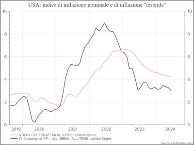 Dal punto di vista macroeconomico, crescita e inflazione globali sopra le attese hanno ridotto la necessità di un taglio dei tassi e la stessa Fed ha “corretto il tiro”, passando dai tre tagli di dicembre 2023 a uno solo a giugno. Con l’inizio del secondo semestre, però, la crescita globale ha cominciato a dare segnali di rallentamento, non solo per via della normalizzazione dei livelli di crescita Usa, ma anche per la debolezza della Cina. Inoltre, l’inflazione sembra essere più sotto controllo negli Stati Uniti, anche per le sue componenti più sticky, cioè più lente a calare (vedi Figura 4). Da ultimo, Banche Centrali e mercati sembrano essere abbastanza d’accordo sul numero di tagli previsto per il 2024 sia in Europa che negli Usa. Tutto ciò ha influito sulle prospettive dell’obbligazionario e, al momento, stimiamo che il riassorbimento delle recenti dislocazioni tecniche porterà presto a un riallineamento tra i mercati monetari americani e la Fed.