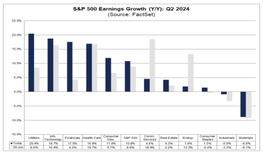 In primis la stagione degli utili si è ormai conclusa, con circa il 91% delle aziende che ha già riportato i risultati trimestrali, mostrando una crescita degli utili del 10.8%, superiore alle aspettative del 8.9%. I settori che stanno guidando le crescite degli utili sono Utilities, Tecnologici, Health Care e Finanziari. Se però andiamo ad analizzare i ricavi, che sono la maggior parte delle volte anticipatori della futura crescita, notiamo una situazione diversa. In termini di ricavi, il 59% delle società dell’S&P 500 ha registrato ricavi effettivi superiori alle stime, un dato inferiore alla media quinquennale del 69% e alla media decennale del 64%. Quindi dal punto di vista dei ricavi si nota un rallentamento della crescita.