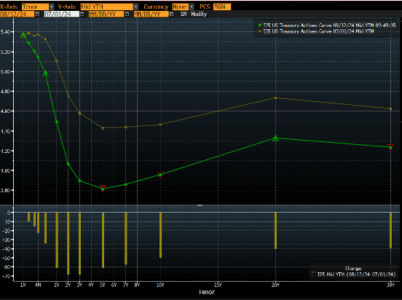 Ad esclusione della FED le principali banche Centrali dei paesi sviluppati hanno già tagliato i tassi. BCE, Banca Nazionale Svizzera (addirittura due volte), Banca d’Inghilterra tutte hanno iniziato il processo di tagli. Verso fine mese avremo i principali Banchieri Centrali riuniti a Jackson Hole dove ci si attendiamo conferme da parte della FED del taglio di settembre. Come vediamo dal grafico di destra dall’inizio del secondo semestre, la curva americana ha avuto una riduzione superiore ai 50 centesimi dai 2 anni in su. Questo ci evidenzia come le aspettative degli investitori si stiano già muovendo per un taglio dei tassi.