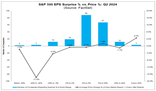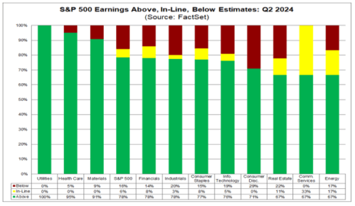 Uno degli aspetti fondamentali della preparazione è la comprensione delle attese sul ciclo degli utili e delle implicazioni sulle valutazioni di mercato; le due variabili chiave che guidano gli equity nel lungo periodo. Attualmente, dopo circa il 75% delle società dell’S&P 500 che hanno riportato i risultati per il secondo trimestre 2024, circa l’80% delle aziende americane ha riportato utili superiori alle stime, con una sorpresa media degli utili per azione tra il 4% e il 5% rispetto alle attese.