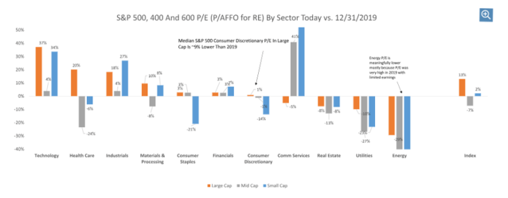 Dal punto di vista valutativo i mercati in generale, così come moltissimi settori all’interno del mercato, si sono oggi riportati ai livelli pre-pandemia. Alcuni di questi settori trattano a premi considerevoli rispetto al 2019, ad esempio il settore tecnologico e quello dei consumer services sono a premio del 40%.