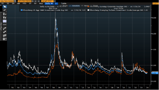 Gli spread obbligazionari, in particolare quelli di investment grade, sono un indicatore chiave della salute economica. La compressione o l’allargamento degli spread riflette le aspettative del mercato riguardo al rischio di credito e alla stabilità economica. Identificare opportunità nel mercato obbligazionario richiede un’analisi attenta di questi spread e della politica monetaria globale. Attualmente gli spread sono molto compressi, ma un allargamento sarebbe fisiologico in caso di deterioramento del quadro macro.