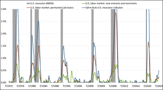 La Figura 1 mostra le tendenze a lungo termine dei mercati del lavoro statunitensi e l’indicatore della Sahm Rule.