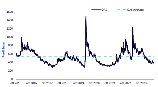 Fonte: WisdomTree, Markit. Periodo che va dal 01/10/2015 al 23/07/2024. I calcoli includono dati da test retrospettivi. “OAS” indica l’option-adjusted spread riportato da Markit e si basa sull’effettiva ponderazione del valore di mercato duration-adjusted. Le date di riferimento (workout date) utilizzate nel calcolo dell’OAS delle singole obbligazioni si azzerano alla fine del mese se le obbligazioni non vengono richiamate. Questo approccio di calcolo condiziona le cifre dell’OAS per l’indice inframese, fino a quando le date di riferimento non si azzerano. La strategia è rappresentata dall’iBoxx Contingent Convertible Liquid Developed Europe AT1 Index. Non è possibile investire direttamente in un indice. La performance storica non è indicativa di quella futura e qualsiasi investimento può diminuire di valore.