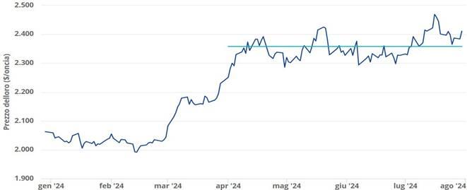 L’oro ha registrato una media di circa 2.358 dollari l’oncia dal picco di aprile.
