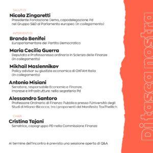 Negli scorsi mesi, più di 130 economisti hanno sottoscritto un Manifesto intitolato TaxTheRich, riprendendo un’iniziativa internazionale di Oxfam sul tema, che propone di aumentare l’equità fiscale aumentando la progressività delle imposte, aumentandone la base imponibile e tassando i grandi patrimoni. Ne parleranno con la senatrice Cristina Tajani venerdì 27 a partire dalle 17:30 in Fondazione Feltrinelli a Milano (viale Pasubio 5) Nicola Zingaretti, Alessandro Santoro, Misha Maslennikov, Antonio Misiani e Brando Benifei. L’evento è organizzato in collaborazione con Fondazione Feltrinelli, Fondazione Demo e Innovare X Includere. |