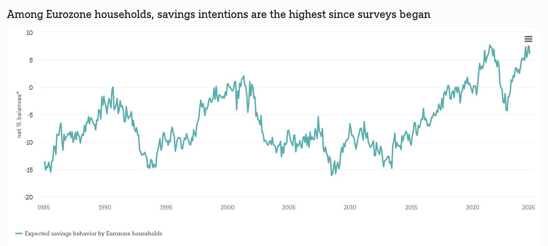 In qualità di membro del Comitato esecutivo della Banca centrale europea (BCE), la signora Schnabel è senza dubbio consapevole del fatto che ciò solleva alcuni problemi piuttosto complicati in teoria. In pratica, però, sembra che l’attuale livello dei tassi di interesse abbia incentivato le famiglie dell’Eurozona a risparmiare di più e a spendere di meno. Citando i dati di un sondaggio risalente agli anni ’80, ha sottolineato che le intenzioni di risparmio per l’anno successivo non sono mai state così alte come in questi giorni. Questo dato è evidenziato dal nostro grafico della settimana, che analizza il saldo netto dei partecipanti al sondaggio che prevedono di aumentare, anziché ridurre, i propri risparmi.