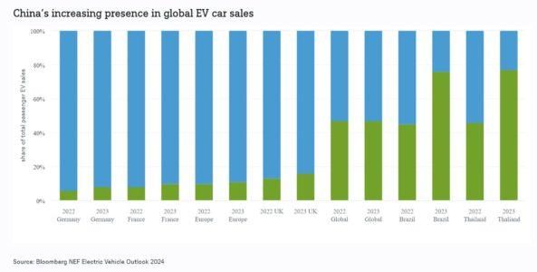 Grazie a questi successi, e forse anche a causa di una sovraccapacità che supera persino la rapida crescita del mercato interno, i marchi cinesi hanno rivolto sempre di più la loro attenzione all’estero. Ultimamente, le case automobilistiche cinesi hanno avuto particolare successo in altri mercati emergenti. In Brasile, le vendite di veicoli elettrici per passeggeri sono quasi triplicate nel 2023 e le case automobilistiche con sede in Cina rappresentano ora il 76% di tutte le vendite di veicoli elettrici. A dire il vero, le vendite totali di veicoli elettrici rappresentano ancora meno del 5% di tutte le vendite di autovetture in Brasile. Ma ci sono aumenti di quote di mercato simili in altre parti del mondo, come mostra il nostro grafico della settimana. La quota delle case automobilistiche cinesi nelle vendite di veicoli elettrici in Tailandia è aumentata dal 46% nel 2022 al 77% nel 2023. Sebbene la loro penetrazione nei mercati europei rimanga significativamente inferiore, la crescita è stata rapida dalla prima Giornata mondiale dei veicoli elettrici nel 2020. All’epoca, le auto cinesi rappresentavano poco più del 2% delle vendite totali di veicoli elettrici in Europa; lo scorso anno, la loro quota ha raggiunto l’11%.