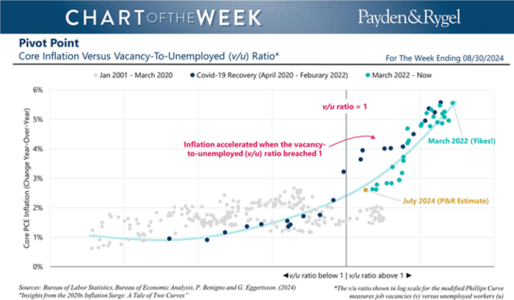 L’inflazione core, misurata attraverso l’indice dei prezzi delle spese per consumi personali (PCE), a luglio è aumentata solo del 2,6% su base annuale, valori lontani dal picco del 5,6% toccato nel febbraio 2022. La scorsa settimana, in occasione del simposio di Jackson Hole, il presidente della Fed Powell ha celebrato la quasi miracolosa moderazione dell’inflazione, che non ha avuto ripercussioni economiche significative. In particolare, Powell ha citato un documento presentato al simposio, che suggerisce come la curva di Phillips (che stabilisce una relazione positiva tra attività economica e inflazione) si inasprisca quando la domanda di lavoro supera di gran lunga l’offerta. La carenza di manodopera ha accompagnato cinque delle sei crisi inflattive che si sono verificate negli Stati Uniti dal 1913. In effetti, nel 2021-2023, l’inflazione ha subito un’accelerazione non appena il rapporto v/u si è spostato al di sopra dell’1. Il rapporto v/u potrebbe tornare a 1 in autunno, e a quel punto il mercato del lavoro non rappresenterebbe più una minaccia per l’inflazione. Di conseguenza, nella mente dei policymaker, l’ammorbidimento del mercato del lavoro rafforzerebbe l’ipotesi di un taglio dei tassi e qualsiasi ulteriore indebolimento giustificherebbe un ritmo più rapido dei tagli dei tassi. È ora di cambiare rotta.