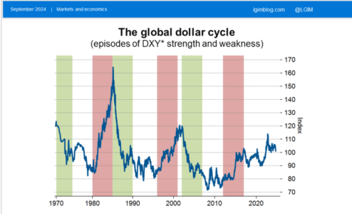 Alla luce di tutto quanto riportato sopra, viene da chiedersi cosa comporterà il taglio dei tassi da parte della Fed, che ormai sembra dover accadere il prossimo 18 settembre, ma anche il fatto che questa dovrebbe ridurre i tassi più di tutte le altre banche centrali nel corso del prossimo anno. Secondo noi di LGIM, la combinazione valutazioni elevate/taglio dei tassi andrà a contrarre il valore del USD, il che potrebbe rappresentare un punto di svolta per i mercati emergenti, che potrebbero invertire il trend negativo osservato negli ultimi 11 anni.