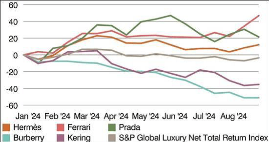 Nel settore del lusso, il differenziale in termini di performance tra vincitori e vinti può essere molto ampio, al punto che chi vince piglia tutto. Finora nel 2024 il differenziale è stato significativo. La figura seguente mette a confronto i vincitori da inizio anno, ovvero Hermès, Ferrari e Prada, con le società che hanno ottenuto le performance meno brillanti, come Kering e Burberry.