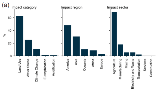 Attualmente, la valutazione degli impatti e delle dipendenze della biodiversità è ancora in una fase embrionale. La mancanza di dati necessari per condurre un’analisi quantitativa a livello aziendale, così come l’assenza di requisiti normativi di divulgazione, rappresentano ostacoli significativi. Ad oggi le divulgazioni ambientali aziendali si concentrano principalmente sulle emissioni di gas serra, mentre metriche quali uso dell’acqua e rifiuti tendono a considerare (e quantificare) solo gli impatti diretti. Per dimostrare e far emergere gli impatti della biodiversità in ambito economico e finanziario, abbiamo effettuato uno studio dedicato all’analisi della “doppia materialità” che coinvolge ecosistemi e aziende, evidenziando come una simile analisi possa essere utilizzata dalle istituzioni finanziarie e dagli investitori istituzionali. Nella nostra ricerca “Biodiversity impact assessment for finance[5]” abbiamo preso come riferimento l’indice MSCI ACWI, che traccia la performance del mercato azionario globale, raggruppando circa 3000 aziende di grandi e medie dimensioni, presenti rispettivamente in 23 paesi sviluppati e 24 emergenti. I risultati hanno evidenziato l’importanza dell’impatto geografico e dimostrano come la maggior parte dell’impatto sulla biodiversità sia causato dal continente americano, seguito subito dopo dall’Asia, nonostante la scarsa rappresentanza di quest’ultima all’interno dell’indice (6%). L’Europa, invece, è responsabile di un minor impatto. Questi risultati sottolineano la necessità di monitorare la localizzazione della filiera produttiva e i collegamenti della supply chain globale in quanto i prodotti venduti in un paese potrebbero avere impatti significativi sulla biodiversità in altre aree del pianeta a causa dell’approvvigionamento di specifici input di produzione.