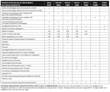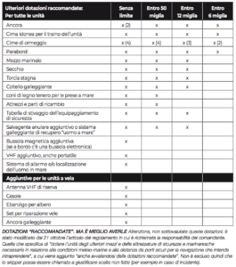 Fuochi a mano: 2 invece di 3 entro le 50 miglia oppure un dispositivo a led conforme alle norme. Razzi a luce rossa 2 invece di 3 entro le 50 miglia. Un orologio a bordo oltre le 6 miglia. Un pallone nero per le unità che superano i 7 metri di lunghezza in navigazione oltre i 300 metri dalla costa, da mostrare quando si è alla fonda. Fischio e campana (o dispositivo sonoro portatile) per le unità di oltre 12 metri di lunghezza in navigazione oltre 1 miglio dalla costa. Gps e bussola magnetica o elettronica aggiornati.