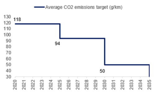 Fonte: EUR-LEX, stime Morgan Stanley Research. Nota: obiettivo 2020 adeguato al protocollo WLTP (Worldwide harmonized light vehicles test procedure).