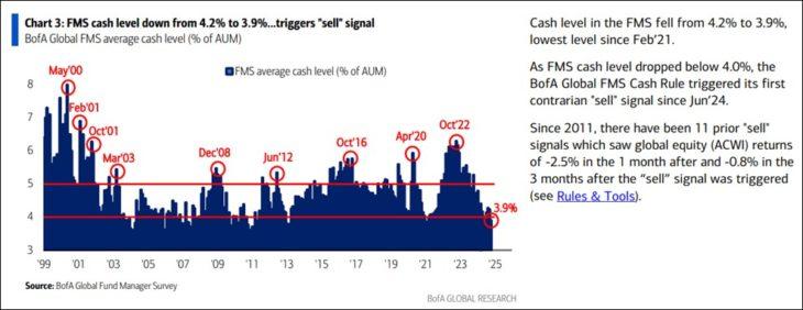 Il mercato sembra inoltre essere particolarmente ottimista in vista delle elezioni, cosa rara. Questo grafico di BofA evidenzia i momenti storici in cui il mercato ha aumentato la liquidità (cerchi rossi). Questa elezione è in controtendenza: la paura di perdere un taglio delle tasse di Trump e un rally del mercato azionario indotto dal deficit fiscale sembra più forte delle preoccupazioni per i dazi, i disordini in Medio Oriente, la debolezza della Cina o le pressioni deflazionistiche nel petrolio e nelle materie prime.