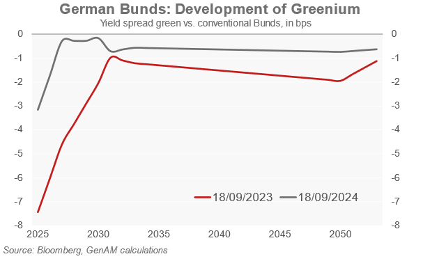 In generale, da notare che rispetto a un anno fa si è registrato un leggero calo del greenium (il premio delle obbligazioni verdi rispetto a quelle tradizionali). Ad esempio, le obbligazioni tedesche hanno un greenium compreso tra 0 e 1 punti base (ad eccezione del green bond con scadenza 2025).