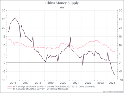 La fiducia dei consumatori cinesi, minata dalla pandemia, non si è mai del tutto ripresa e la crescita delle vendite al dettaglio si è rivelata piuttosto modesta. Il rallentamento dell’attività economica emerge anche dall’analisi delle misure monetarie: la M2, ad esempio, che misura la quantità di moneta e credito presente all’interno di un’economia, appare in significativa contrazione (vedi grafico sotto).