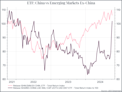 Rispetto al passato, quando il governo cinese aveva prontamente adottato misure ad hoc di sostegno all’economia, questa volta la reazione delle autorità alla contrazione della domanda si è fatta attendere, ma, alla fine, si è concretizzata in un forte taglio di uno dei tassi d’interesse principali, in alcune misure a sostegno del mercato immobiliare e in interventi diretti sul mercato azionario. Tali provvedimenti hanno avuto un impatto notevole sui listini: se si confronta la performance di un ETF azionario cinese rispetto a un ETF che investe nei Mercati Emergenti al di fuori della Cina, si nota subito come, dopo una significativa sottoperformance registrata a partire dall’inizio del 2023, con i recenti annunci politici i mercati azionari abbiano recuperato gran parte dello svantaggio (vedi grafico sotto).