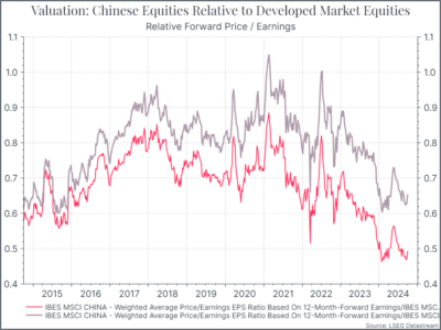 Se poi si confronta la valutazione relativa dell’azionario cinese rispetto all’azionario dei mercati sviluppati e all’azionario non statunitense prima dell’annuncio del pacchetto di stimoli, si noterà una costante riduzione delle valutazioni delle azioni cinesi negli ultimi anni.