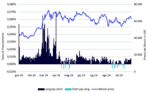 Fonte: GlassNode. 01 ottobre 2024. Il tasso di finanziamento medio (in %) è fissato dalle borse per i contratti futures perpetui. Quando il tasso è positivo, le posizioni lunghe pagano periodicamente le posizioni corte. Quando il tasso è negativo, le posizioni corte pagano periodicamente le posizioni lunghe. Lo storico dei rendimenti non è indicativo di quelli futuri e gli investimenti potrebbero subire una riduzione di valore.