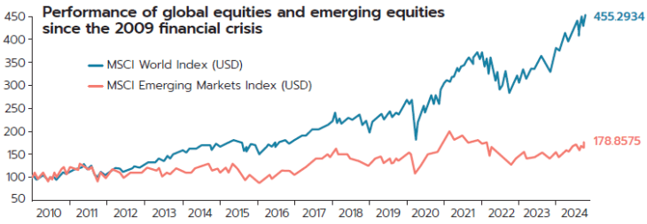 Questo settore si è fatto la nomea di distruttore di speranze degli investitori, avendo spesso disatteso le aspettative per una ripresa economica più solida. Lo si può osservare da come l’equity dei mercati sviluppati, nell’arco temporale osservato, abbia sempre sovraperformato quello emergente, come si può evincere dal grafico sottostante.