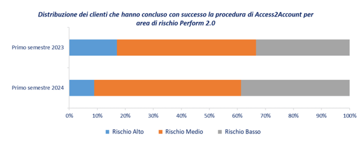 L’analisi del profilo di rischio dei consumatori digitali che utilizzano l’Open Banking nel 2024 evidenzia anche uno spostamento verso profili meno rischiosi. Nel primo semestre 2024 i soggetti che concludono la procedura PSD2 sono molto meno concentrati nell’area a Rischio Alto (-9 p.p.).