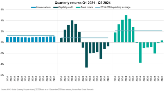 Nel secondo trimestre del 2024, le perdite di valore sono diminuite allo 0,74%, la correzione trimestrale più bassa dei due anni precedenti, ma sono state compensate dai redditi pari all’1,07%, che hanno portato quindi l’immobiliare globale a registrare un rendimento positivo dello 0,33%, il primo trimestre positivo dal secondo trimestre del 2022 .