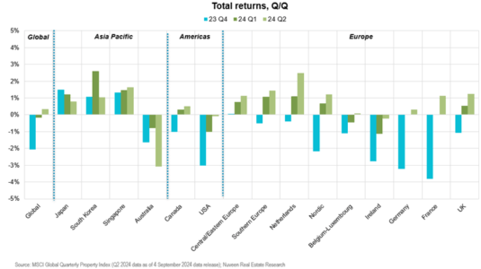 Nei 15 mercati globali che compongono l’MSCI Global Property Index, una leggera maggioranza ha registrato un aumento dei valori immobiliari nel secondo trimestre, per la prima volta dal secondo trimestre del 2022. Otto mercati hanno registrato un aumento dei valori rispetto al trimestre precedente: Giappone, Corea del Sud, Singapore, Europa meridionale, Paesi nordici, Paesi Bassi, Francia e Regno Unito.