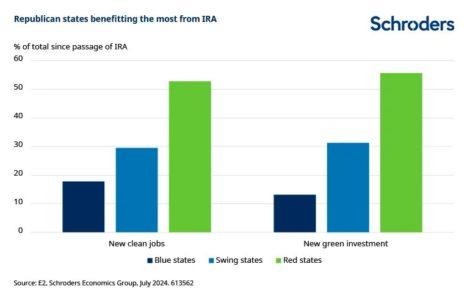 Nel ruolo di vicepresidente, Kamala Harris ha svolto un ruolo cruciale, esprimendo il voto decisivo per approvare la legge sul clima IRA. Al contrario, durante la sua campagna, Trump ha messo in evidenza la possibilità di espandere la produzione di combustibili fossili. Dall’approvazione dell’IRA, nell’agosto 2021, oltre il 50% dei nuovi posti di lavoro e delle spese in conto capitale è stato annunciato negli Stati a maggioranza repubblicana, rispetto al 20% negli Stati a maggioranza democratica. Si tratta di forti incentivi per mantenere in vita i sussidi verdi, il che indica che è improbabile che un cambio di potere faccia deragliare la transizione energetica degli Stati Uniti. Sono presenti troppe ragioni economiche sottostanti e i benefici sono troppo diffusi per un cambio di rotta.