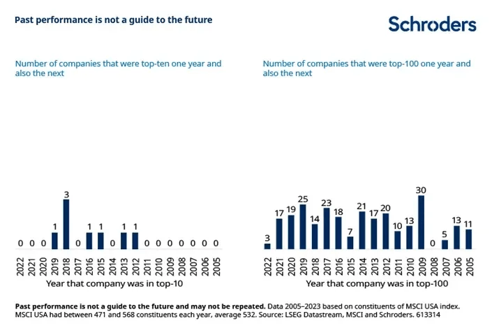 In 12 degli ultimi 18 anni, non c’è stato un singolo titolo della top 10 azionaria statunitense capace di entrare in classifica anche l’anno successivo. In cinque degli altri sei anni, solo uno è riuscito nell’impresa. Nell’altro, tre titoli ce l’hanno fatta a malapena. Anche la permanenza nella top 100 è rara. Una media di 15 società all’anno è riuscita a rientrare nella top 100 per due anni consecutivi. Le probabilità di ripetere la presenza nella top 10 o nella top 100 due o tre anni dopo sono altrettanto basse.