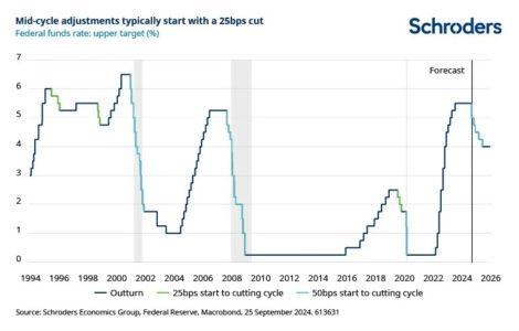 Quando la Federal Reserve avvia un ciclo di tagli con una riduzione di 50 punti base, ciò di solito costituisce motivo di preoccupazione. Lo ha fatto a gennaio 2001 e settembre 2007, appena tre o quattro mesi prima che l’economia statunitense precipitasse in recessione, così come a marzo 2020, all’inizio della pandemia globale. Alla luce di ciò, avevamo ipotizzato che la banca centrale avrebbe tratto spunto dagli adeguamenti di metà ciclo del 1995, 1998 e 2019. In quelle tre occasioni, un rallentamento della crescita (piuttosto che una recessione) spinse la Fed a iniziare a tagliare i tassi con una riduzione convenzionale di 25 pb.