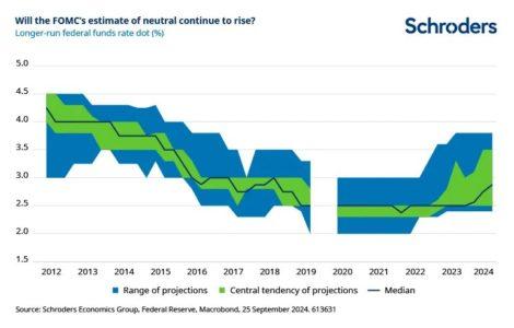 Tuttavia, dubitiamo che la Fed procederà a un allentamento di altri 100 punti base il prossimo anno, come suggerito dal dot plot. Non crediamo che questa traiettoria si realizzerà, considerata l’incertezza sia nell’ambito dell’ampia gamma di previsioni tra i 19 membri del FOMC, sia nelle previsioni esterne relative a dove si attesti il tasso neutrale. La stima dello stesso comitato sul livello del tasso neutrale si può ricavare dalla mediana del dot plot “a più lungo termine” dei suoi membri, che attualmente è pari a circa il 2,875%, indicativamente 200 pb in meno rispetto all’intervallo attuale. Tuttavia, questo tasso neutrale implicito è aumentato a ogni riunione di quest’anno, dopo essere rimasto fermo al 2,5% per gran parte del periodo 2019-2023. Quindi, se si concretizzasse una prospettiva più ottimistica per l’economia statunitense, sarebbe ragionevole supporre che il dot mediano possa aumentare ulteriormente.