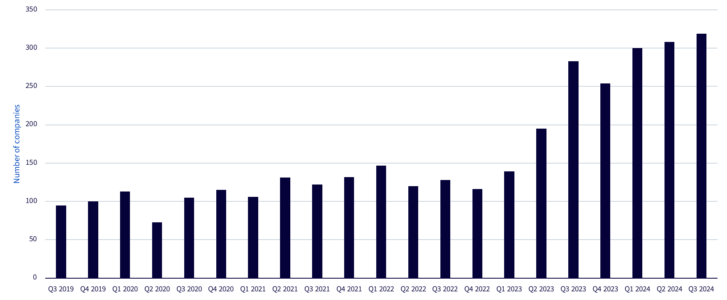 Non appena voltata la pagina sul 2024, abbiamo assistito a un aumento di circa il triplo nel numero di aziende facenti menzione dell’IA ad ogni trimestre.
