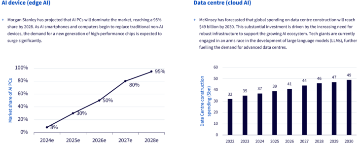 Per costruire questa infrastruttura e per effettuare gli investimenti nella seconda metà del 2024, molte delle spese vengono destinate ai data center, coinvolgendo una serie di aziende produttrici di semiconduttori – non solo Nvidia. È possibile che, se guardiamo al passato con il beneficio della storia, Nvidia abbia conquistato la fetta più grande della torta economica complessiva per quanto riguarda i “picks and shovels”. Tuttavia, affinché l’IA raggiunga l’intero panorama economico, riteniamo che saranno necessari molti tipi diversi di chip prodotti da un largo numero di aziende.