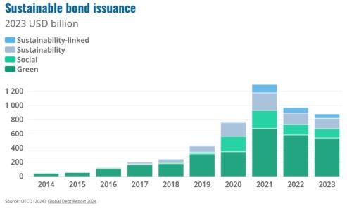 Il mercato obbligazionario sostenibile è emerso nell’ultimo decennio ed è cresciuto rapidamente dal 2018. Alla fine del 2023, l’ammontare globale in circolazione di obbligazioni sostenibili ha raggiunto i 4,3 trilioni di USD, rispetto ai 641 miliardi di USD di appena cinque anni prima. La rapida crescita del mercato delle obbligazioni sostenibili è motivo di ottimismo. Se i proventi di tutte le emissioni di obbligazioni sostenibili vengono investiti in progetti che offrono benefici ambientali e sociali a costi relativamente bassi, gli investitori e la società in generale ne trarranno profitto. Tuttavia, i quadri normativi e le istituzioni competenti devono garantire che i mercati funzionino in modo efficiente e che gli interessi degli investitori siano tutelati. Questa sessione si concentrerà sul capitolo 3 del Global Debt Report 2024 dell’OCSE: Bond Markets in a High-Debt Environment, che esamina lo stato del mercato e le considerazioni politiche sulle obbligazioni sostenibili. Nel mercato obbligazionario sostenibile, il settore aziendale rappresenta oltre la metà dell’emissione totale.