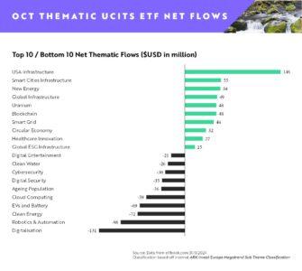 Per quanto riguarda i deflussi, i maggiori a ottobre sono stati registrati dagli ETF sulla Digitalizzazione (-130 milioni di dollari). Il tema è dominato dalle solite “magnifiche 7” tech, e gli investitori sono alla ricerca di una diversificazione maggiore.