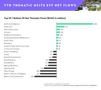 Guardando ai dati da inizio 2024, infatti, gli ETF sull’Intelligenza Artificiale hanno guidato gli afflussi con la ragguardevole cifra di 1,47 miliardi di dollari. L’IA continua a catturare l’attenzione degli investitori come forza di trasformazione, con progressi e applicazioni significative in tutti i settori. Al contrario, Robotica e automazione – considerato ora come categoria a sé – risulta proprio il tema che ha sofferto di più, con -897 milioni di dollari. Gli investitori si concentrano dunque sempre più strettamente sull’IA, mentre l’interesse per aree più ampie come l’automazione industriale diminuisce.