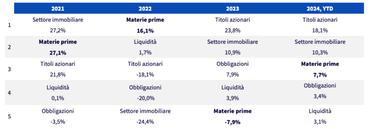 Fonte: WisdomTree, Bloomberg. Tutti i rendimenti sono espressi in USD. Dal 31 dicembre 2020 al 4 ottobre 2024. Dati: Titoli azionari – MSCI World, Obbligazioni – Bloomberg Barclays Agg Sovereign TR Unhedged, Settore immobiliare – EPRA/NAREIT Global, Bloomberg Commodity Total Return Index, Liquidità – US T-Bill 3 Mth. La performance storica non è indicativa di quella futura e qualsiasi investimento può diminuire di valore.
