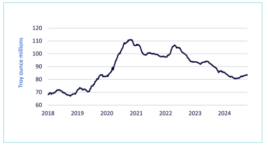 Al di là del sondaggio, i dati relativi ai flussi degli ETC (exchange-traded commodity) sull’oro confermano la persistenza dei deflussi tra maggio 2022 e maggio 2024 (Figura 3). Tuttavia, da allora abbiamo notato una ripresa degli afflussi. Durante il periodo dei deflussi, i prezzi dell’oro hanno toccato nuovi massimi, quindi è chiaro che alcuni investitori hanno perso un’opportunità. Ma non è troppo tardi. Come illustrato nel nostro ultimo outlook per l’oro, è probabile che il metallo giallo continui a raggiungere nuovi massimi che, secondo le nostre previsioni interne, potrebbero arrivare a 3.030 USD/oncia entro il terzo trimestre del 20253.