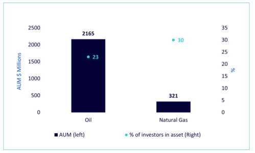 Leggendo i risultati del sondaggio, un’ulteriore sorpresa riguarda il fatto che gli investitori nel gas naturale sono più numerosi di quelli nel petrolio. Il divario a favore del primo è aumentato nell’ultimo anno. Tuttavia, in termini di massa gestita (AUM), vi sono molti più asset in ETC sul petrolio emessi in Europa che in ETC sul gas naturale emessi in Europa (Figura 4). Il sondaggio sembra indicare che, nonostante il numero di investitori nel settore petrolifero sia inferiore, vista la più elevata AUM che detengono collettivamente, la loro entità deve essere più ampia.