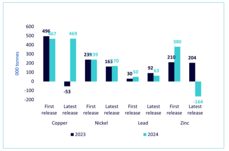 Vorremmo sottolineare che le previsioni sull’equilibrio tra domanda e offerta possono talvolta rivelarsi estremamente distanti dalla realtà, quindi gli investitori dovrebbero continuare a rivalutare le dinamiche di produzione e domanda. Ad esempio, a gennaio 2022 l’International Copper Study Group aveva previsto un’eccedenza di rame di 467.000 tonnellate per il 2023, mentre di fatto abbiamo assistito a un deficit di 53.000 tonnellate (Figura 5). A ottobre 2023, l’International Lead and Zinc Study Group si aspettava un’eccedenza di zinco di 380.000 tonnellate nel 2024 (Figura 5). A settembre di quest’anno, la previsione è stata rivista, passando a un deficit di 164.000 tonnellate.