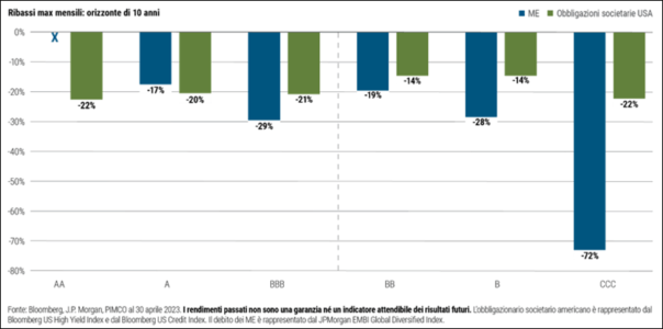 C’è un’ulteriore sfumatura empirica, forse la più importante, che riguarda l’efficienza dei rendimenti a valore di mercato lungo lo spettro della qualità, catturata da indicatori come lo Sharpe ratio che misura il rendimento corretto per il rischio. Analogamente ai fondamentali del rischio di credito, per le obbligazioni di minore qualità le metriche di volatilità dei valori di mercato sono molto più alte per i ME che per il debito societario americano, con Sharpe ratio più bassi per il debito dei ME con rating singola B e CCC.