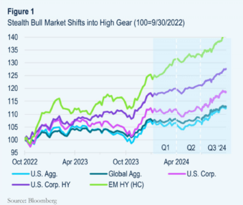 In un contesto di condizioni obbligazionarie rialziste sostenute da rendimenti solidi e spread in contrazione, gli investitori attendono lo slancio del mercato grazie a uno spostamento verso rendimenti più bassi dopo il picco dei tassi. Tuttavia, i rendimenti dei Bund e dei Treasury rimangono vicini agli stessi livelli che occupavano circa due anni fa all’inizio del mercato rialzista. Tuttavia, anche se i tassi e gli spread rimarranno limitati nel breve termine come prevediamo, il reddito fisso dovrebbe continuare a generare rendimenti solidi.
